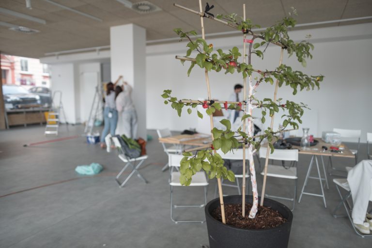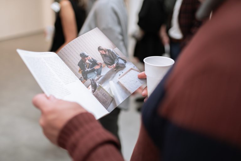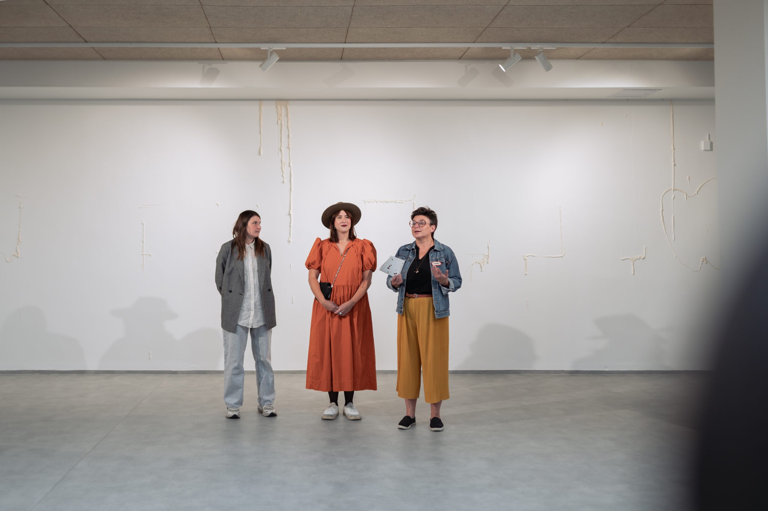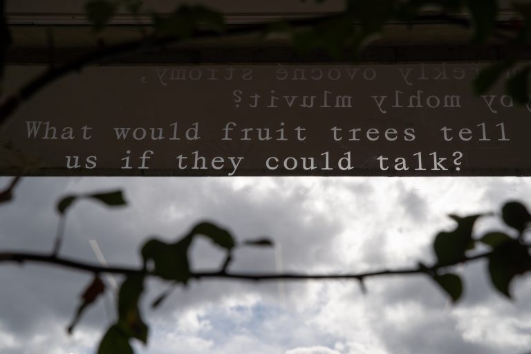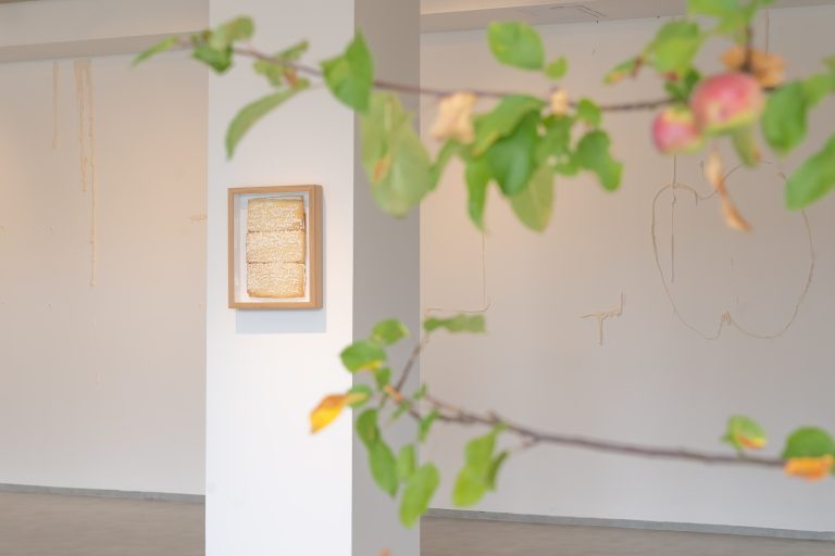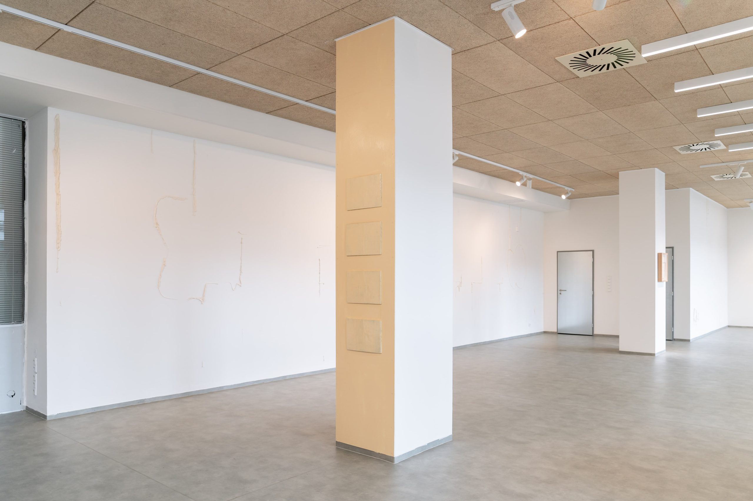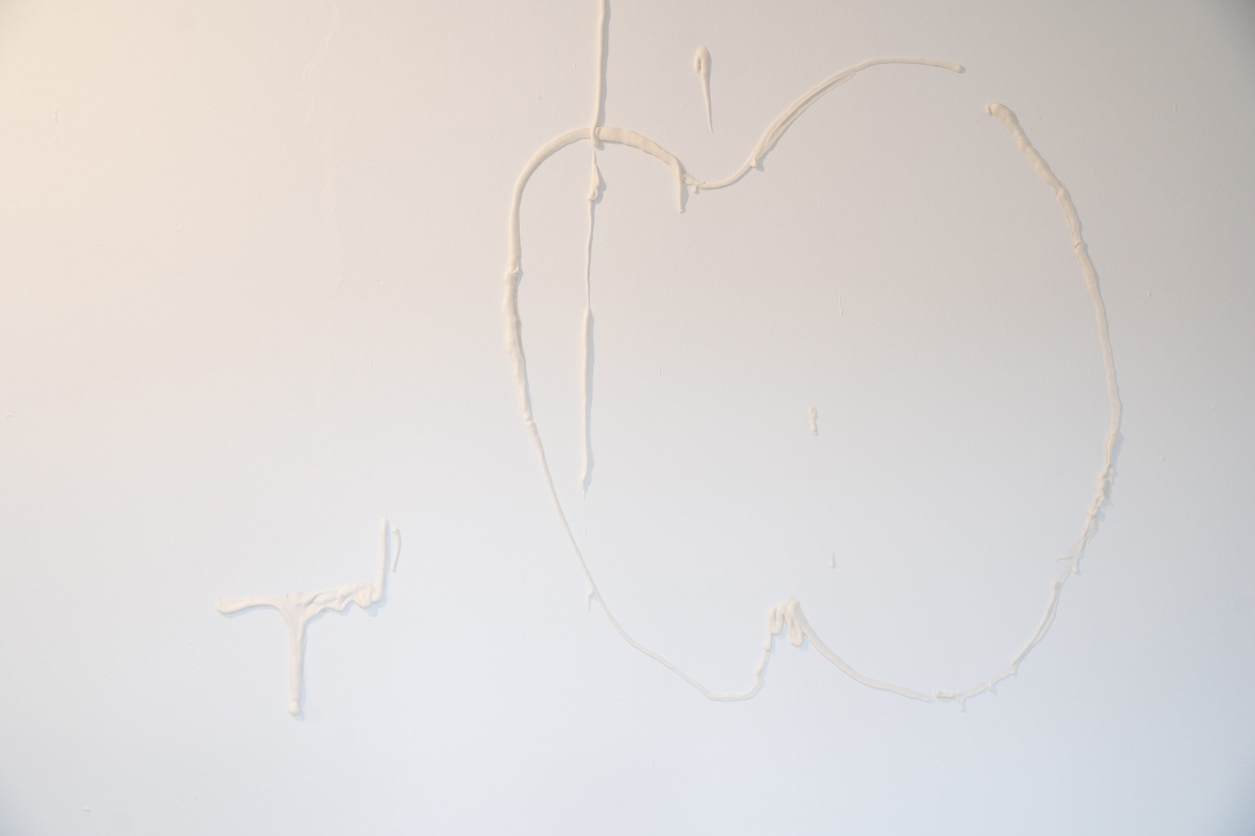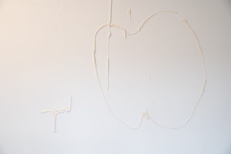 The exhibition consists of seven projects from recent years. The Apple of My Eye (2024) object explores themes such as family tree, belonging, property, and reproduction. The immersive gesture paintings from The Line series (2024) tend to refer to territory and time. The Picnic (2024), monumentally painted ready-made from the Common Issues in Painting and Everyday Life series, is about community, hope, and naivety. The site-specific sugar mural Sweet Deal (2025) focuses on the meaning of loss, forgetting, and ephemerality. Base-Relieved (2025) questions the purposes of monuments and plaques, while Document frescos (2024) reveals our obsession with preserving memories. The exhibition closes with the (bitter)sweet message Double Truth: Reveal (2025), created in collaboration with the curator.